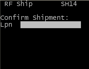 Shipping loads using an RF device To ship load tasks on an RF device: Access the RF device Main menu. From the RF device Main menu, select Outbound Menu. The Outbound Mgmt (OBM) screen is displayed. Click Ship by ID. The RF Ship (SH14) screen is displayed. Scan or specify the LPN to ship. This can be any of the following; Case ID created during allocation Drop ID created during picking or packing The Trailer Number assigned to a load Note: This screen is also available on other RF menus within Outbound Management. If a duplicate transship LPN exists, a warning message is displayed. You must enable the ALLOWDUPTRANSSHIPCNTRLOAD parameter on the System Settings screen, to scan or manually specify duplicate transship LPNs. Click Search. A list of all items for each external shipment is displayed. Note: If you select an item, the additional details related to the item are displayed. Select an item from the list and press Enter twice.