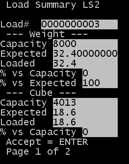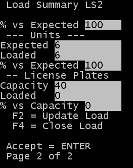 - There are two pages of load summary information. Use the down arrow and up arrow to scroll between pages. The information that is displayed includes: