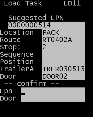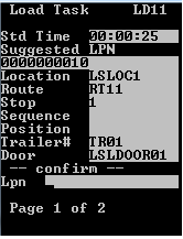 - To complete the load transaction, press Enter. The system remains on the Load Task (LD11) screen until all open tasks for the current stop are completed.