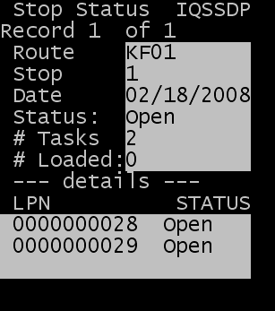 - Specify the route, stop number, and ship date information for the load you want to view. The Stop Status (IQSSDP) screen is displayed.