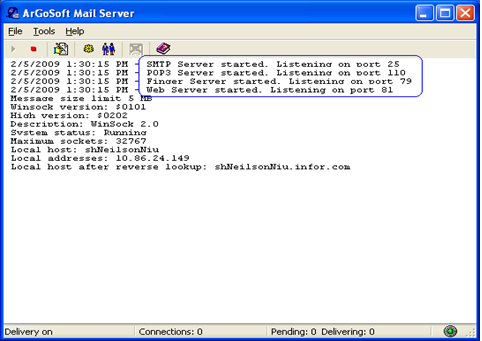 This section describes the ArGo Software Mail Server, as an example. The ArGo Software Mail Server with 30 day evaluation period on Windows platform, is used to send and receive e-mail messages. Use this section and the installation instructions for release 1.8 of the ArGo Software Mail Server.